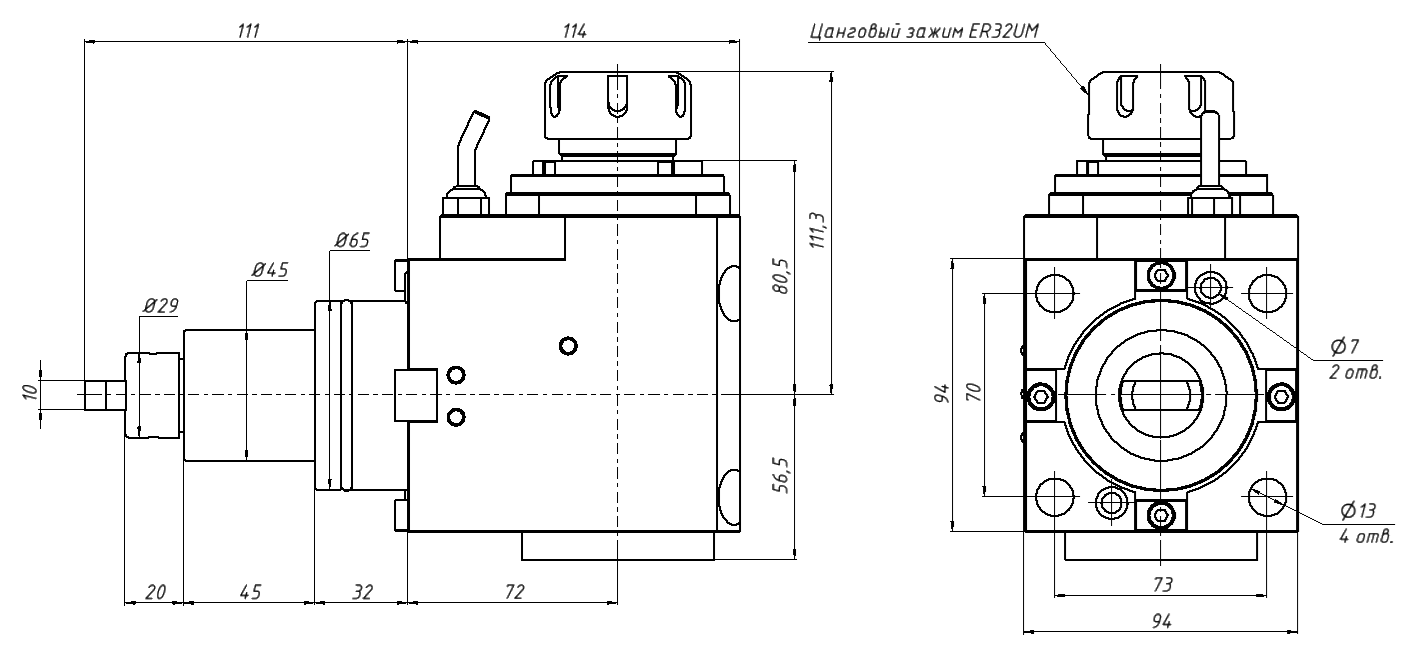 Радиальный приводной цанговый блок BMT65-90-72-ER32 представляет собой инструментальный блок, предназначенный для закрепления режущего инструмента с цилиндрическим хвостовиком. Инструмент зажимается с помощью цанги ER32, которая не входит в комплект поставки и приобретается отдельно.