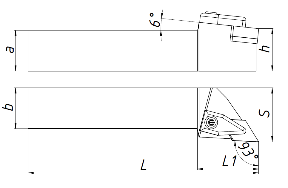 Державка токарная для наружной обработки по металлу со сменными пластинами. Крепление типа D (двойной прижим кронштейном). С углом в плане 93°. Предназначена для контурной обработки и точения торца. Державка совместима с пластинами DN**1104**.