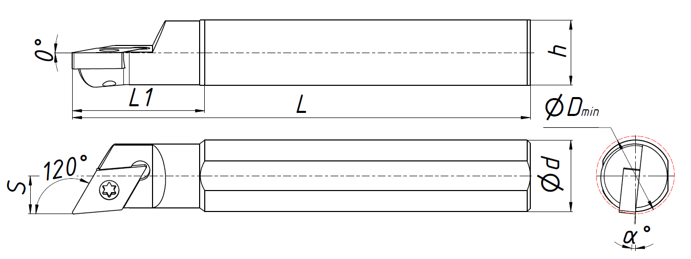 Державка токарная для внутренней обработки по металлу со сменными пластинами. Крепление типа S (закрепление пластин винтом). С углом в плане 120°. Предназначена для растачивания отверстий и обработки торца. Державка совместима с пластинами DC**11T3**.