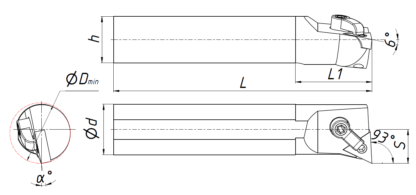 Державка токарная для внутренней обработки по металлу со сменными пластинами. Крепление типа M (прижим клин-прихватом сверху). С углом в плане 93°. Предназначена для растачивания отверстий и обработки торца. Державка совместима с пластинами TN**1604**.