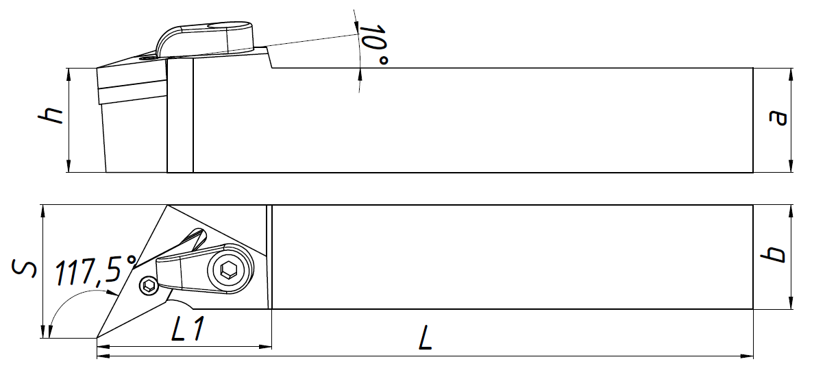 Державка токарная для наружной обработки по металлу со сменными пластинами. Крепление типа M (прижим клин-прихватом сверху). С углом в плане 117.5°. Предназначена для наружной контурной обработки. Державка совместима с пластинами VN**1604**.