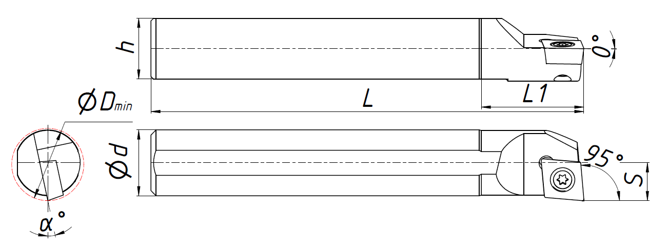 Державка токарная для внутренней обработки по металлу со сменными пластинами. Крепление типа S (закрепление пластин винтом). С углом в плане 95°. Предназначена для растачивания отверстий и обработки торца. Державка совместима с пластинами CC**0602**.