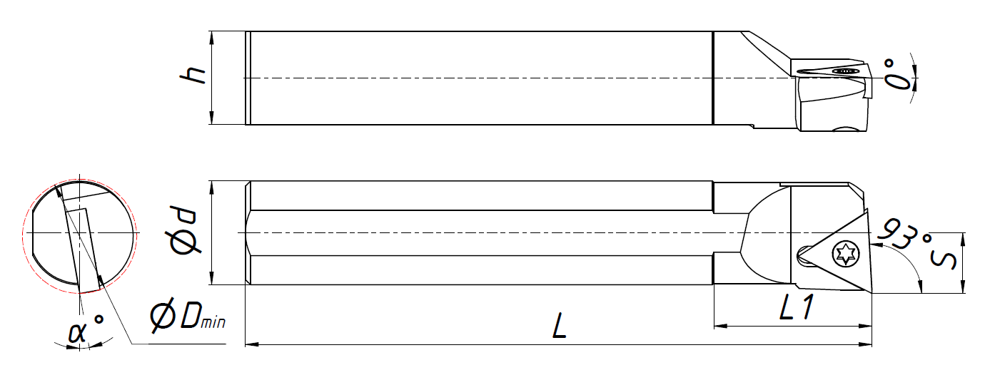 Державка токарная для внутренней обработки по металлу со сменными пластинами. Крепление типа S (закрепление пластин винтом). С углом в плане 93°. Предназначена для растачивания отверстий и обработки торца. Державка совместима с пластинами TC**16T3**.