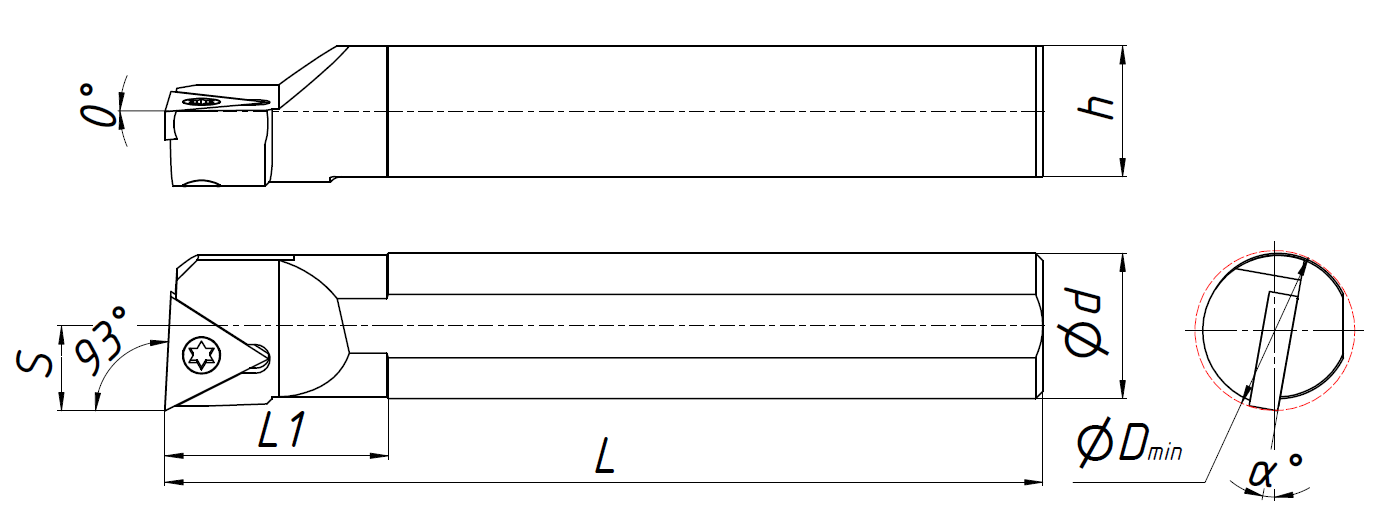 Державка токарная для внутренней обработки по металлу со сменными пластинами. Крепление типа S (закрепление пластин винтом). С углом в плане 93°. Предназначена для растачивания отверстий и обработки торца. Державка совместима с пластинами TC**16T3**.