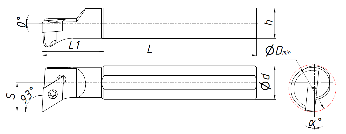 Державка токарная для внутренней обработки по металлу со сменными пластинами. Крепление типа S (закрепление пластин винтом). С углом в плане 95°. Предназначена для растачивания отверстий и контурной обработки. Державка совместима с пластинами DC**11T3**.