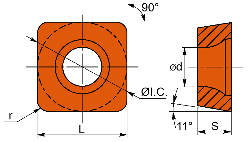 Исполнение W – односторонняя с крепежным отверстием и без стружколома