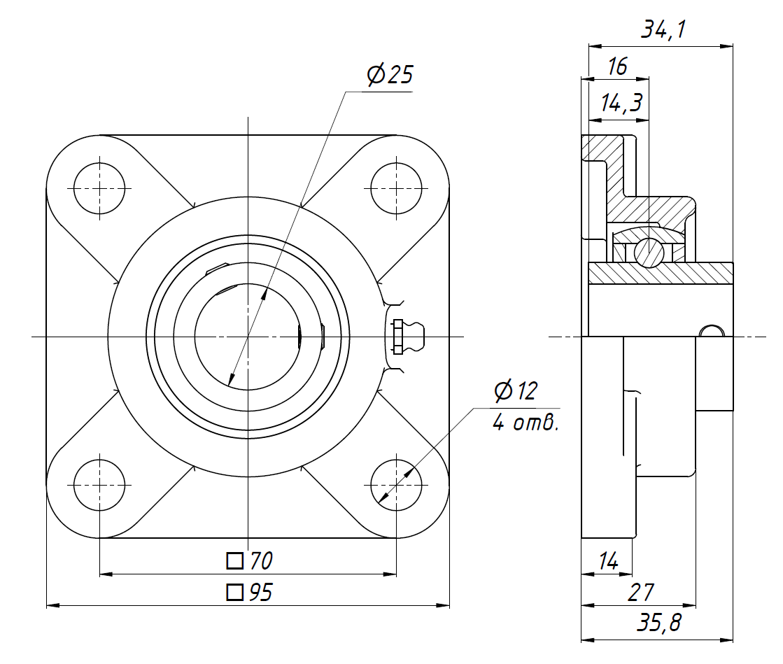 Подшипниковый узел применяется в качестве опоры вращающегося вала. Узел состоит из чугунного корпуса с шариковым радиальным однорядным подшипником. Подшипник в корпусе самоцентрируется компенсируя перекосы и угловые смещения вала. Двустороннее уплотнение подшипника защищает тела качения от попадания пыли, влаги и других абразивных частиц. Для смазки подшипникового узла используется комплектная пресс-масленка. Вал в подшипнике фиксируется с помощью двух установочных винтов.