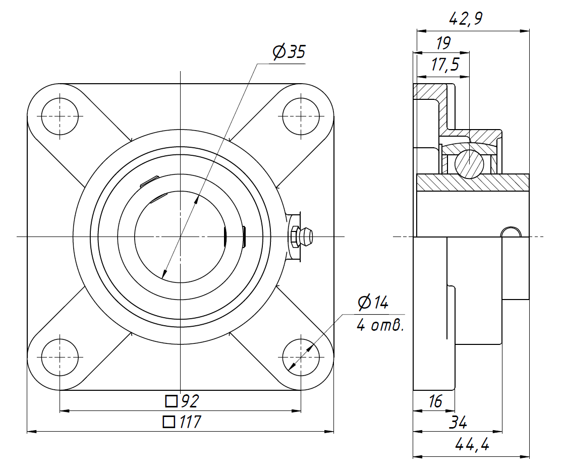 Подшипниковый узел применяется в качестве опоры вращающегося вала. Узел состоит из чугунного корпуса с шариковым радиальным однорядным подшипником. Подшипник в корпусе самоцентрируется компенсируя перекосы и угловые смещения вала. Двустороннее уплотнение подшипника защищает тела качения от попадания пыли, влаги и других абразивных частиц. Для смазки подшипникового узла используется комплектная пресс-масленка. Вал в подшипнике фиксируется с помощью двух установочных винтов.