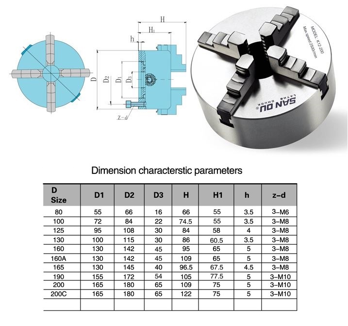Патрон токарный K12-160 с 4 кулачками с двумя комплектами кулачков используется для прямого и обратного зажима заготовки при токарной и фрезерной обработке.