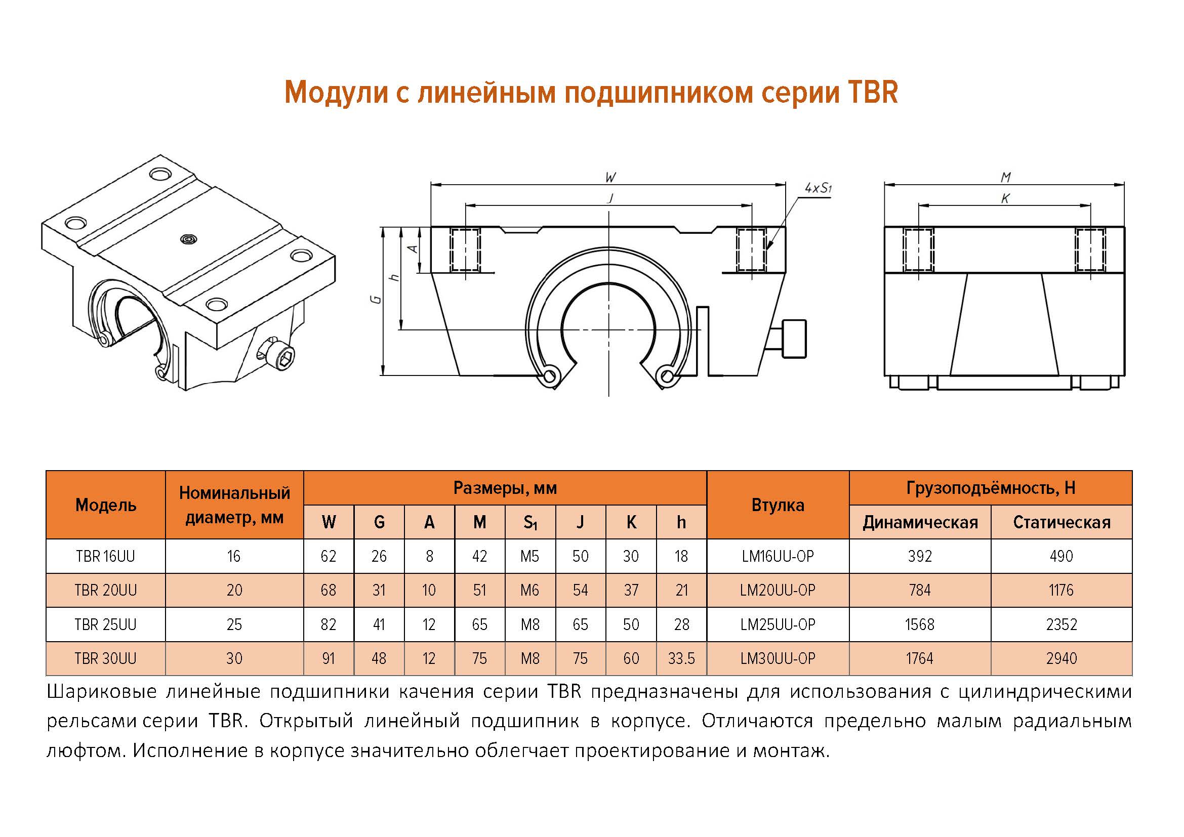 Фланцевые модули с линейным подшипником предназначены для использования совместно с цилиндрическими рельсами серии TBR. Они представляют собой алюминиевый корпус, содержащий в себе линейный шариковый подшипник LM-OP (открытого типа). Обладают сбалансированными показателями точности и жесткости.